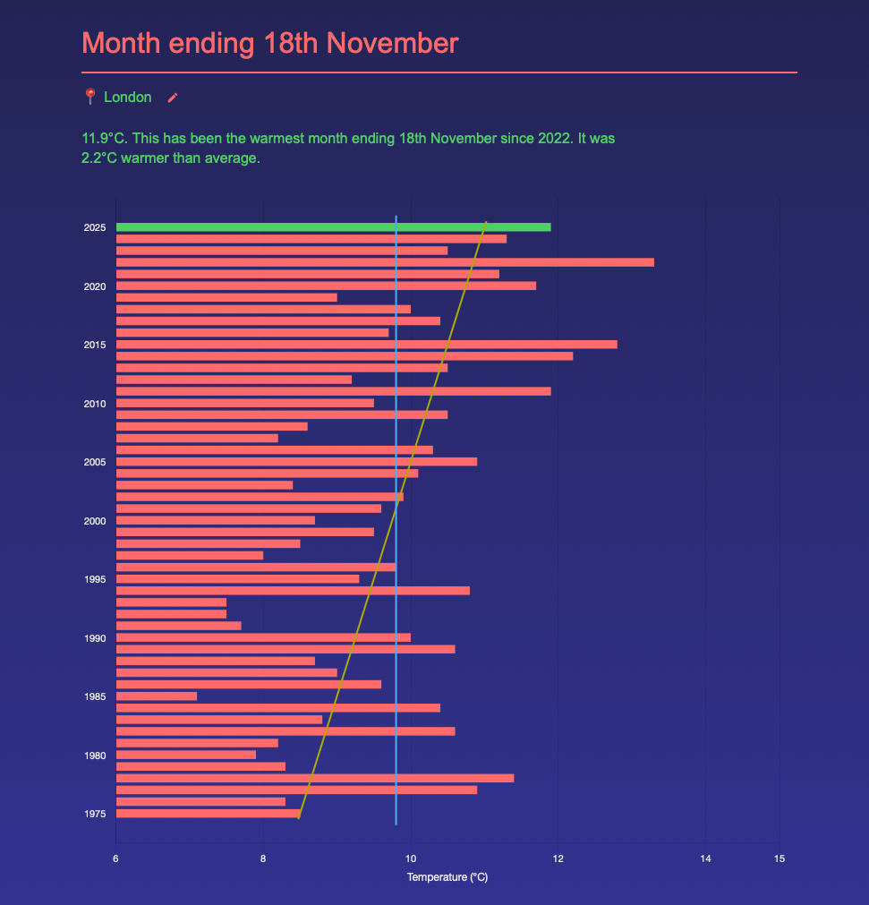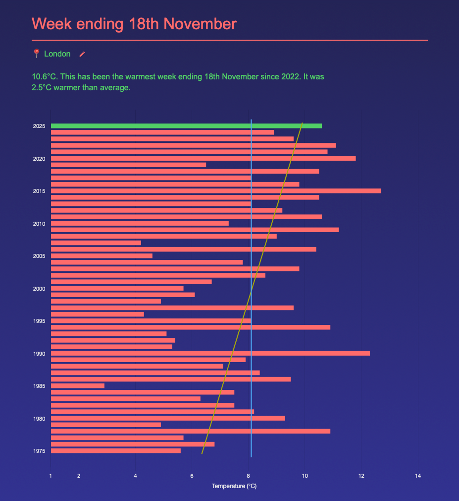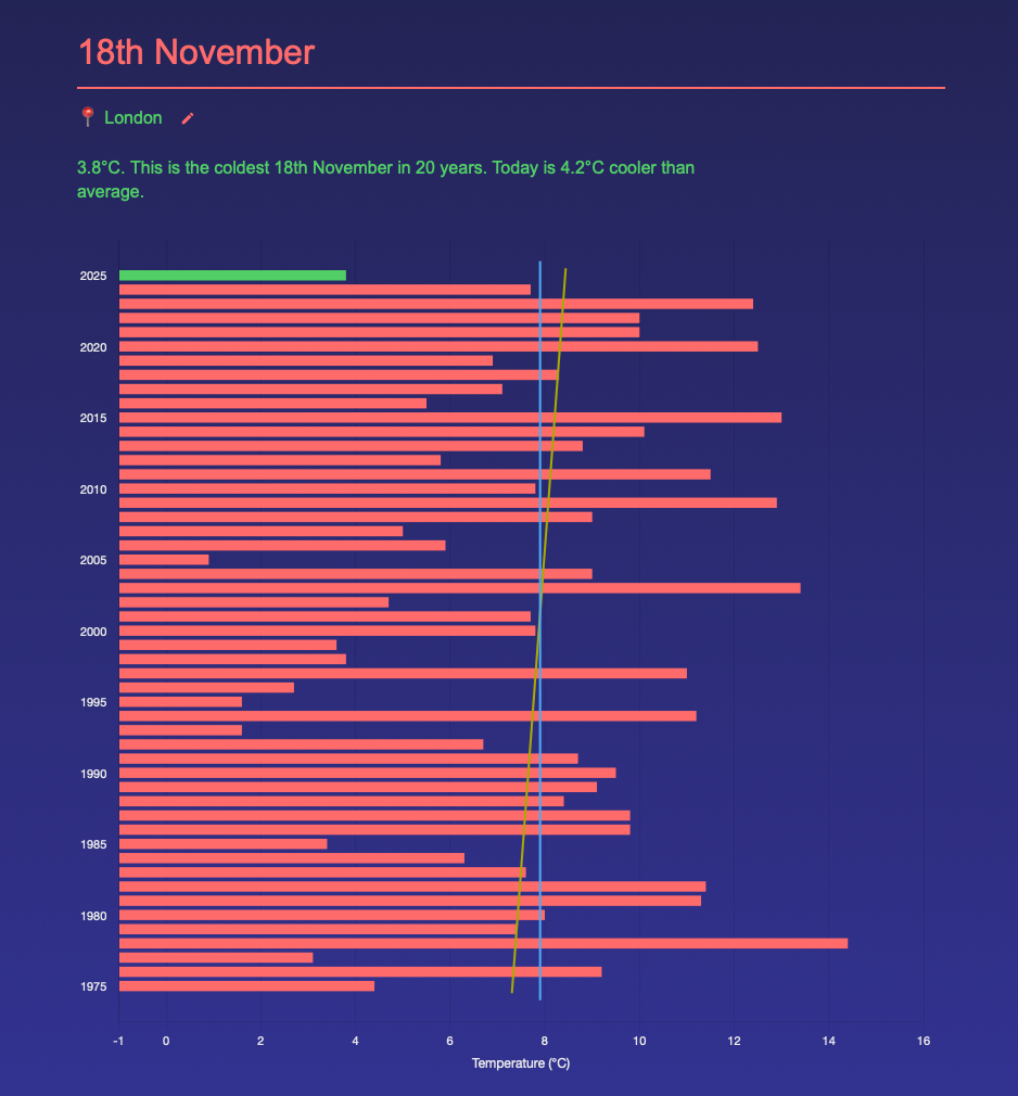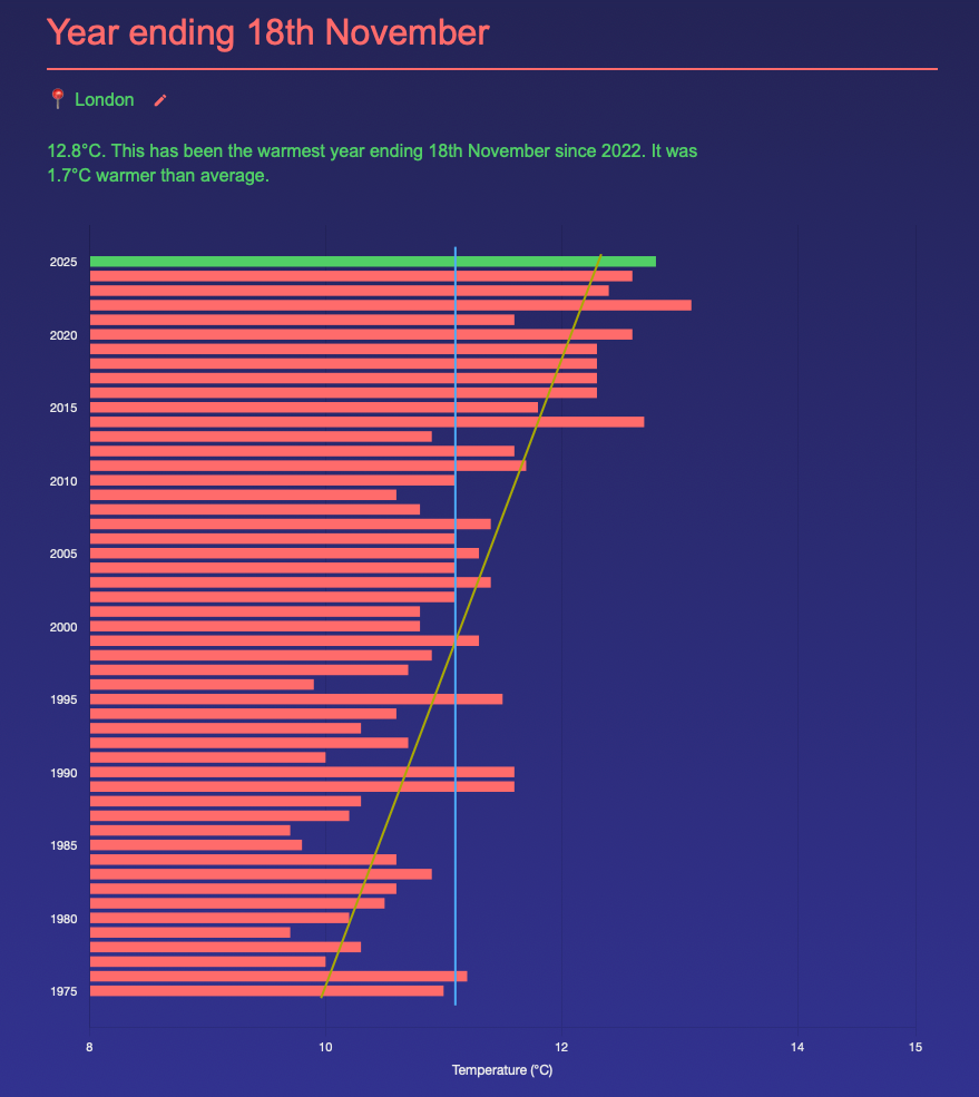 That blue line is the average temperature for all 18th Novembers over the past 50 years, back to 1975.